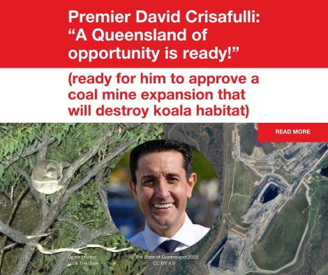 Despite our readers and more signing an open letter to the Qld Government asking them to reject Glencore’s Hail Creek mine (Issue 75 August last year), the Crisafulli Government has approved it. The project will bulldoze 600 hectares, home to a nationally significant koala population; mine coal until 2040; and threaten water resources.